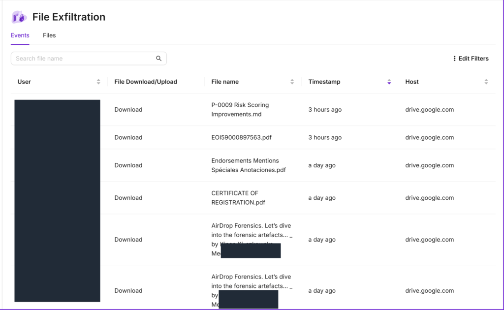 - Data exfiltration: Track downloads of sensitive company resources (e.g. documents originating from the corporate drive) and keep track of where they have been uploaded and shared. This is especially important with the increasing use of AI tools such as GPT to perform tasks on company resources. The scope of data collection is configurable by security admins to balance employee privacy with risk visibility.